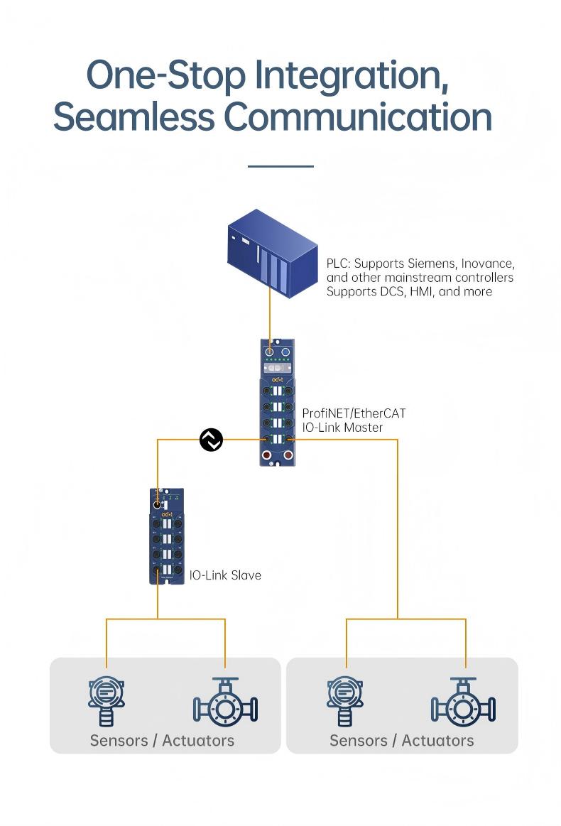 | IP-EC-8IA | Support EtherCAT protocol, and IO-Link master module, 8*Class A interface, each port can be configured independently, support IO-Link/DI/DO, up to 16 digital input or output channels can be configured |